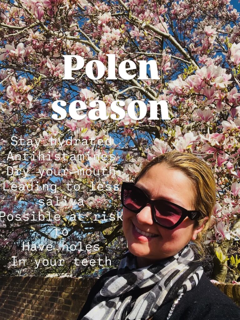 Polen season. Stay hydrated. Antihistamines Might cause as sure effect Dry your mouth. Leading to less saliva Possible at risk to Have holes in your teeth💕